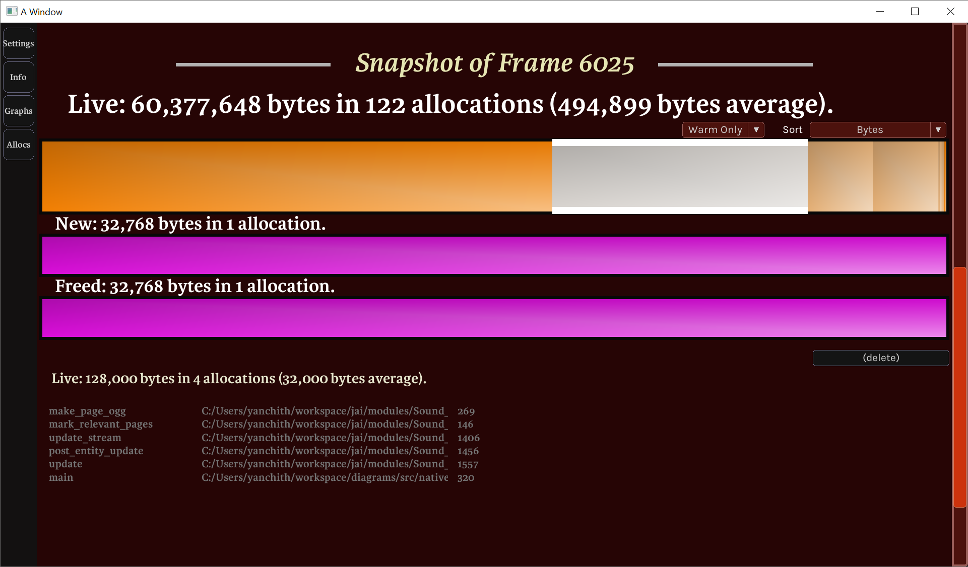The overall experience with JAI was one underlined by pragmaticism. I didn't really have to think about the language very much. It let me do what I wanted, leaving the responsibility of cleaning my own mess to me, but also giving me the tools to do the cleaning. This is a good fit for projects with complicated or unclear designs. These need a lot of iteration and experimentation, but shipping any project requires hardening: systematizing, fixing bugs, optimization. So, somewhere during development, you want to transition from being messy and unconstrained to being organized and precise. JAI allows you to turn this dial as needed, and gives you tools to gradually improve the quality: metaprogramming, profiling tools, instrumenting allocations, visualization tools, etc. To be fair, in my project, I utilized the "let me make a mess" aspect of the language more than the "help me clean it up" one, both because the game is still small enough for it to not require large-scale cleanup before shipping the current prototype version, and this also isn't my first game, so at this point I can avoid some programming and design mistakes ahead of time.